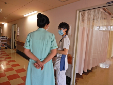 看護師の白衣ではありませんが、ユニホームに着替えて看護体験です。