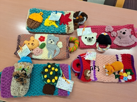 それと・・・手作りのマフをボランティアの方からいただいたと老人看護専門看護師の佐藤さんがもってきてくれました。マフとは認知症の方のケアに使うものです。あまりのすてきなデザインに感動しました!!!
