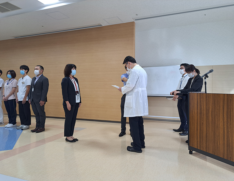 10月2日の朝礼は年度後半のスタートということで、人事異動など辞令交付者多数でした。 看護部も係長心得から係長へ。一緒に頑張りましょう。