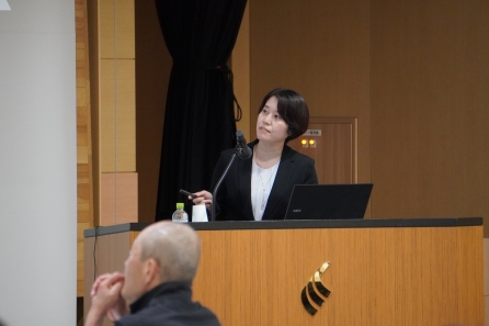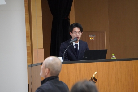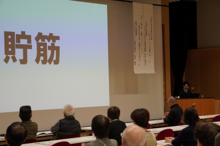 一つ目の講演は、リハビリテーション部 理学療法士 豊田 祐多さんによる、「やって得する 心臓リハビリテーション 貯金は大事ですが、貯筋はもっと大事です」でした。