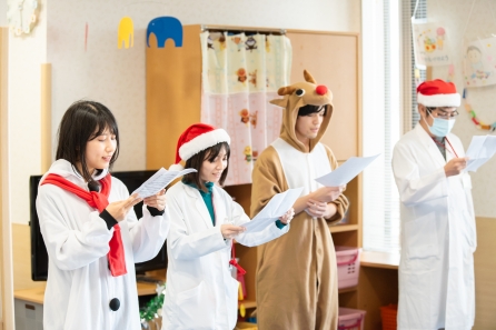 小児科の医師からは歌のプレゼントがありました。クリスマスにちなんだ綺麗な曲、楽しい曲をたくさん聴かせて下さり、子どもたちも知っている曲を一緒に口ずさんだり、リズムにのって体を揺らしたりしながら聴き入っていました。