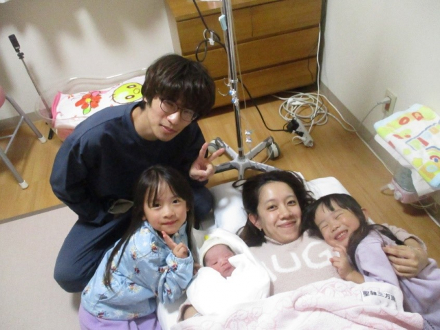 本陣痛なのか判断に迷いつつの入院でしたが、自然に陣痛が強くなりました。家族が立ち会いに間に合うか心配でしたが、無事パパと2人のお姉ちゃん、おばあちゃんが見守る中、元気な男の子が生まれました。