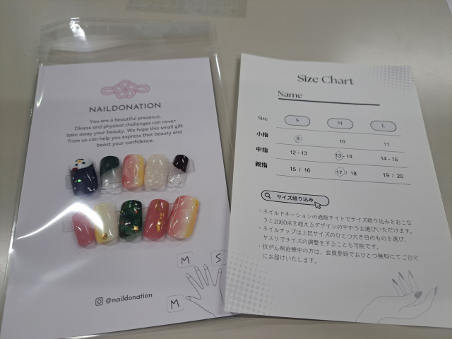 私のサイズで合うもので選びましたが左右別でやや奇抜で迷いましたが「雪だるまかわいい~」と言ってもらい決めました(笑)。これは様々なネイルサロンのネイリストの方々が1つ1つ丁寧につくってきたものです。ディスプレイ用などで入れ替わりになったものを送ってくれるそうです。患者さんには送料のみで提供して下さっているそうです。
