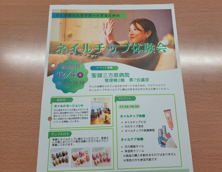 12月4日、がん薬物療法看護認定看護師のK課長が「がん患者さんをサポートするためのネイルチップ体験会」を開催してくれました。当日はネイルサロンを経営し、全国のネイルサロンに「ネイルドネーション」を呼びかけがん患者さんのために活動している方がきて体験会をしてくれました。医療者だけでなく、様々なジャンルの方ががん患者さんのことを真剣に考え活動していることを知りました。