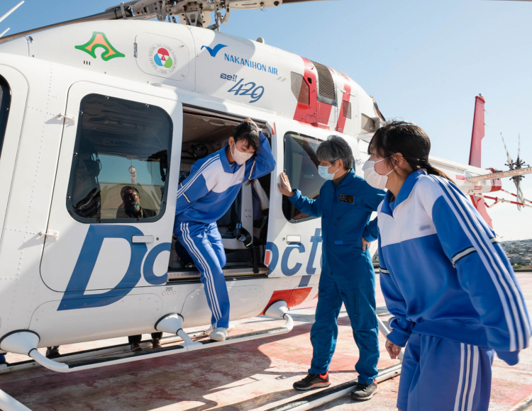 11月19日、浜松市立三方原中学校の1年生17名が、地域学習の一環として当院を見学されました。受診で来院されるときとは少し雰囲気が違うためか、緊張した様子の生徒さんも見受けられました。 まず事務職員による病院の概要説明を受けていただいた後、ホスピスでは病室やファミリーキッチンをご案内し、入院生活や病院食についてお話ししました。続いてヘリポートに移動し、ドクターヘリを見学。普段は上空を飛ぶ姿を見ることがほとんどのため、間近で見る機体に「思っていたより大きい!」という声が上がっていました。整備士のすすめで機内の座席に座った際には、緊張がほぐれたのか笑顔がこぼれました。引率の先生からは「なかな