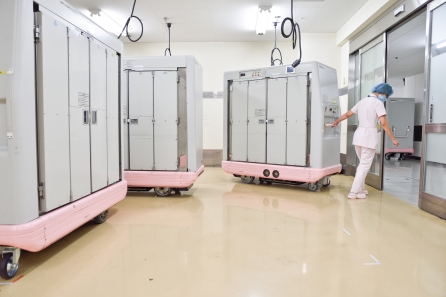 ⑥食事の提供時間に合わせ、温かい料理は配膳車の中で再加熱されます。