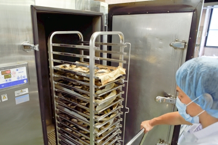 ③食中毒菌が増殖しやすい温度帯を避けるため、焼きあがった魚はブラストチラー(急速冷却する機器)で急速冷却します。