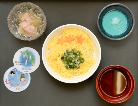 七夕の風習として食べられるそうめんです。卵・オクラ・星型人参などの具をのせ七夕をイメージし、涼しげに見えるよう盛り付けに工夫しました。