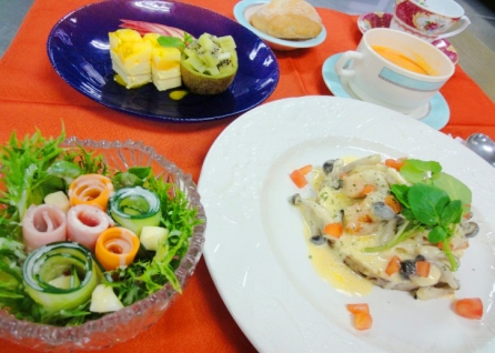 A 「ブーケサラダ」は、人参・胡瓜・ハムを花束のように包んでサラダ全体をブーケにみたてています。デザートの「フルーツ」はカットを工夫して彩り良く見た目でも楽しんでいただけるような盛り付けにしました。「サーモンのソテーきのこクリームソース」はサーモンと濃厚なクリームの相性が良く人気の組み合わせです。
