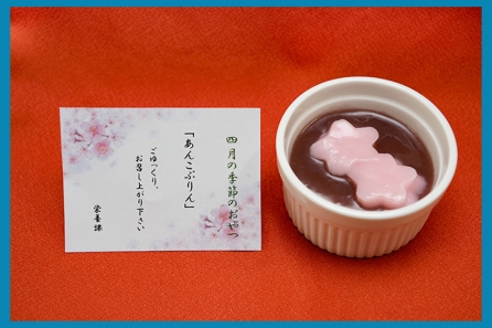 写真の「あんこぷりん」は飲み込む力が弱い方でも食べやすいように、そして春を感じてもらえるようなデザートにしました。桜の花は粥をペーストにしたものを使って餅のような食感に仕上げました。