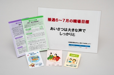 栄養課全体の接遇力のアップを目指して課内の接遇目標を掲げ、朝礼・夕礼時には目標を皆で読み上げたり、接遇に関する問題を出したりしています。また年に数回、接遇チェックを抜き打ちで役職者と広報メンバーで行っています。
