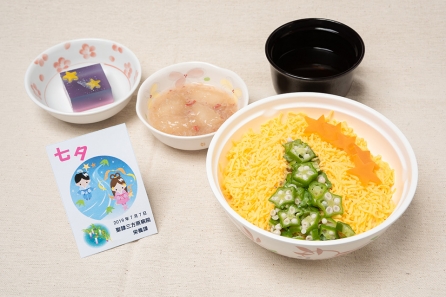 星型の具材をのせて七夕らしい盛り付けにしました。冬瓜の海老あんかけや涼しげなデザートに行事カードを添えています。