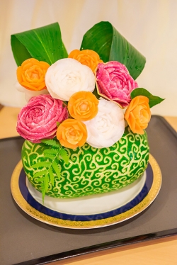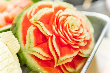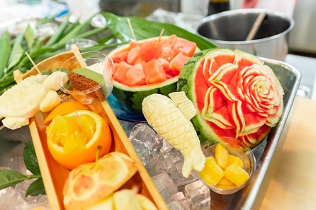 野菜や果物のカービングは、野菜や果物に花草などのモチーフを彫刻するタイの伝統文化で、その昔、宮中の子女たちが王様に楽しんでいただくために飾り付けたのが始まりといわれています。納涼祭に来られた方に目でも楽しんでいただけるように調理師が技術を駆使して作製し、展示しました。