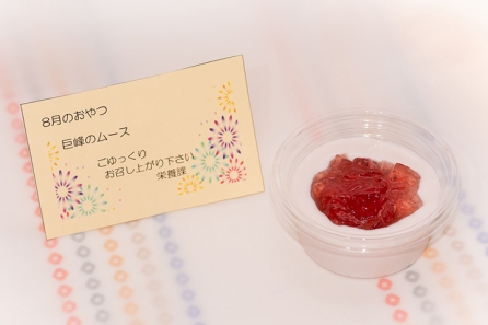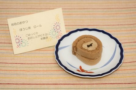 残暑の厳しいこの時期にも食べやすいように、あっさりほろ苦いほうじ茶ロールケーキ、そしてひんやり冷えたぶどうのムースを提供させていただきました。患者さんからは、「さっぱりしていて食べやすかった」などの評価をいただきました。