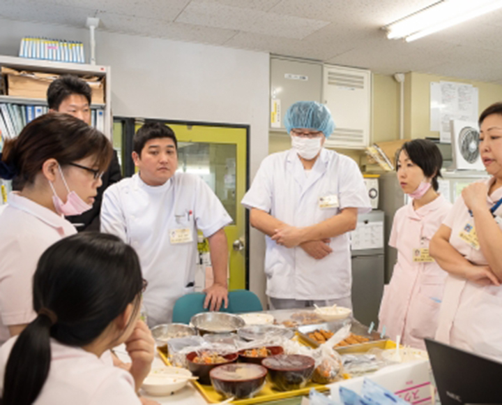 栄養課は、「利用者一人ひとりを尊重した栄養管理と安全で質の高いサービスの提供」を基本方針として、「食」の専門性を発揮し、各専門医療スタッフと連携して患者の病態改善・治療・治癒を目指しています。病院における食事は、『治療の一環』であると共に、『癒し』『楽しみ』の役割を担っています。