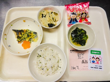 菜飯や焼き魚に煮物と緑が多く春を感じさせる献立です。彩りも良く患者さんに好評でした。
