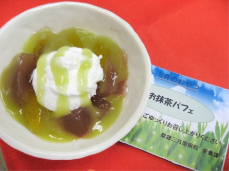 今回は緑茶を使用し季節感を、またゼリー自体の甘味を抑え初夏に合ったさっぱりとしたものに仕上げました。特製抹茶ソース(砂糖、緑茶、牛乳)と生クリームで少しの甘さとコクを付け足しました。