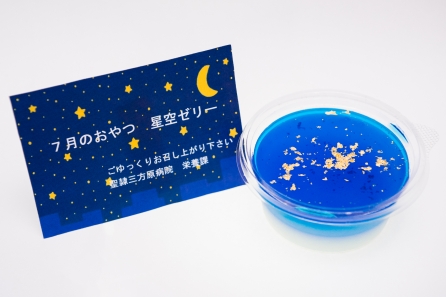 今回は夏にぴったりな鮮やかな青色のゼリーです。またゼリーの上には金粉を散らし、夜の星空に見立てています。下の白い層はカルピスで作っていて、さっぱりとして食べやすいです。