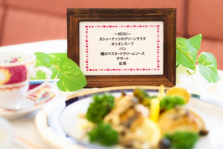 前菜のカシューナッツサラダは、ナッツを焼いて香ばしさや食感を引き出しました。以前のパンはハードだと意見を頂いたので、今回はふわふわした白パンで食べやすくしました。食後のデザートはショコラスポンジを使用したオレンジケーキで、コースの締めくくりに爽やかさを追加しました。栄養面についても管理栄養士と調整を行ないました。
