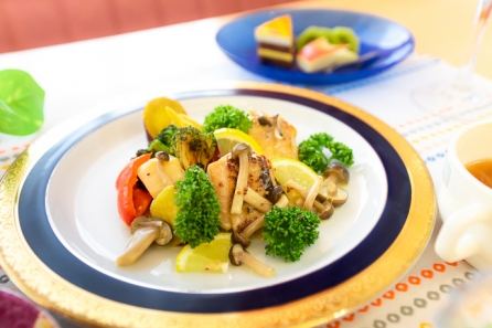 アンケートで「魚より肉料理が食べたい」との意見を多く頂いたので、今回のメインは肉料理にしました。味つけはクリームソースにさっぱり感と味のアクセントを出すため、粒マスタードとレモンを加えました。