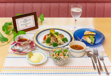 ご出産された方へのささやかなお祝いのお食事として、普段の病院食とは違い調理師が直接サービスさせて頂いています。メニューは当院で出産された方のご要望を元に作成し、デザートと飲み物を含めたコース料理をご用意しています。