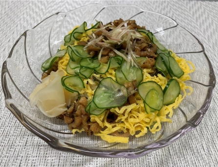 - 皿に3を盛り、きざみ海苔、きゅうり、みょうが、大葉、錦糸卵、煮あなごを彩りよく盛り、がりを添える