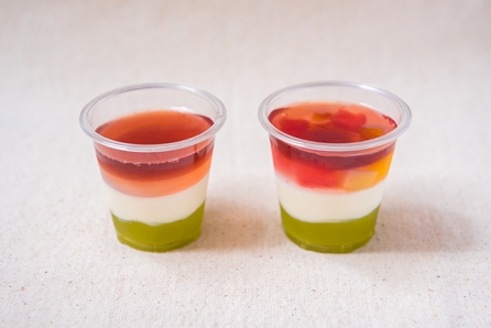 四色の色鮮やかなゼリーに仕上げて、緑はキウイ味のゼリー・白はパンナコッタ・赤はフルーツ(すいか)とサイダーのゼリーの層です。