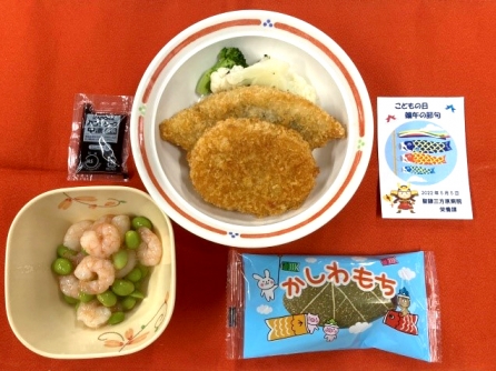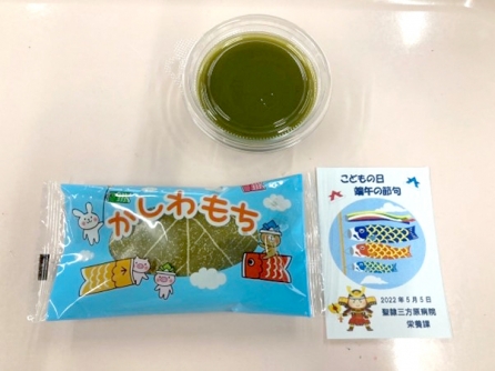 いつものメニューに柏餅(普通食)・抹茶ゼリーにカードを添えて。