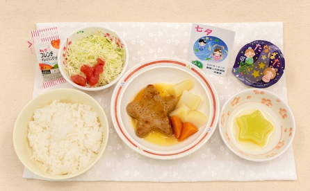 今年は星形ハンバーグに星形の三色ゼリーでした。年配の男性の患者さんに可愛いと褒めていただきました。