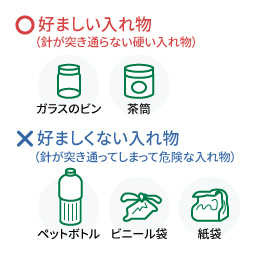 使用後の注射の針は、ふたの付いた缶やビンなど針が突き通らない容器に入れ、まとめておいて、医療機関受診時に注射室あるいは薬剤部に持ってきてください。