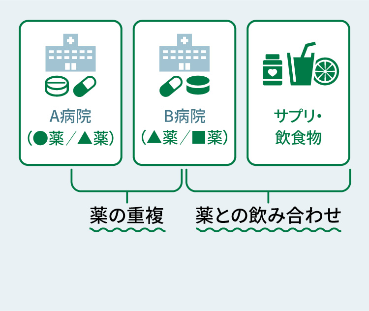 また、他の病院や医院など薬をもらうときにも、医師・歯科医師や薬剤師にお薬手帳を見せることで、同じ薬が重なっていないか、また飲み合わせ等についての確認も行ってもらえます。
