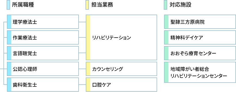 当院リハビリテーション部は5職種が4施設に配置されています。