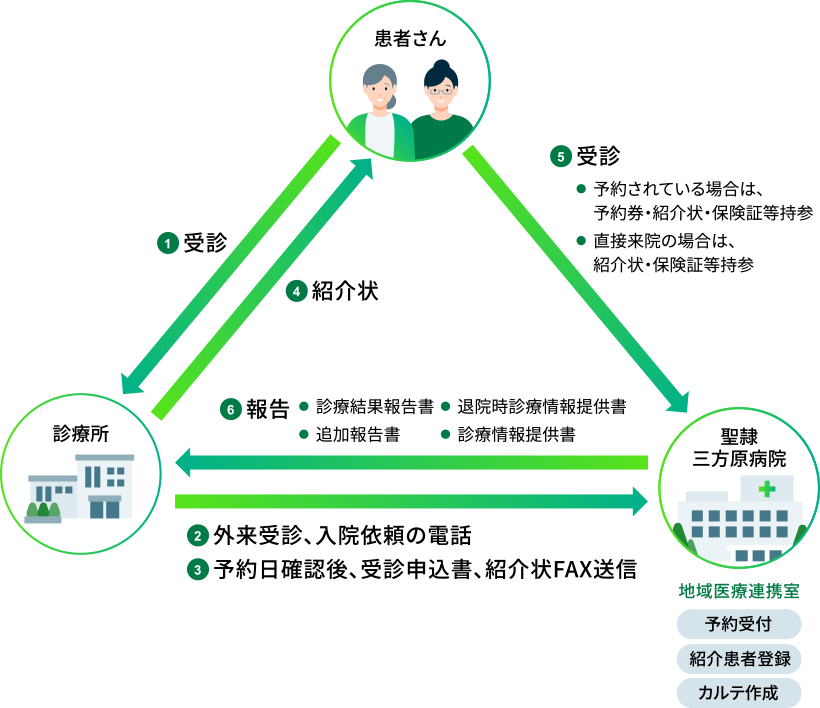 受診の日時が決定後、「紹介予約申込書(様式1)」及び、「紹介状(診療情報提供書)」にご記入いただき、FAX(053-439-0002)にて送信をお願い致します。FAXがご利用できない場合は、電話にて患者情報等の必要事項をお伺いいたします。