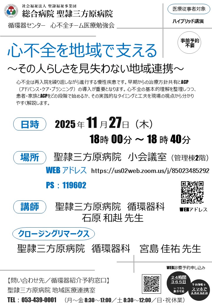 | 講 師 | 聖隷三方原病院 循環器科 石原 和赳 先生 |
