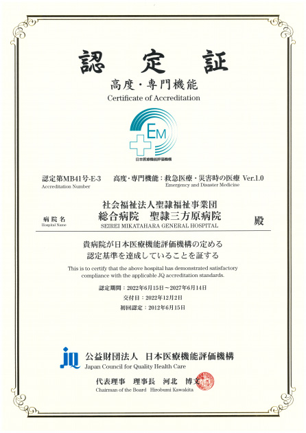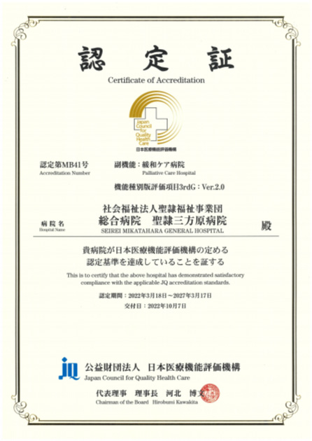 当院は2002年3月16日(Ver.3.1)に初めて認定を取得し、その後5年ごとに認証を更新しています。2022年10月には5回目の認定(機能種別版評価項目3rdG:Ver.2.0)を取得しました。さらに、認定病院が受審できる付加機能評価のうち「緩和ケア機能(Ver.2.0)」の認定を取得し、高度・専門機能として「救急医療・災害時の医療(Ver.1.0)」の認定も受けています。
