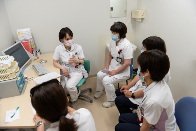 現在のがん治療は、例えば、抗がん剤治療と放射線治療を同時に受けながら、痛みのコントロールをするというように、複数の治療を並行しておこなうことが多くなりました。手術、抗がん剤治療、放射線治療、症状緩和など治療内容によって院内での治療場所も様々です。患者さんの治療内容や場所にかかわらず、途切れることなく支援が受けられるよう、資格を持つ看護師同士で常に連携し患者さんやご家族を支援しています。