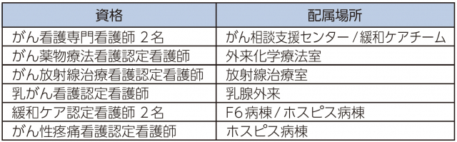 がん治療は、手術、薬物療法、放射線治療、緩和医療の4つを組み合わせておこなわれます。治療の過程を支援するために、当院にはがん関連の資格を持つ看護師が8名いる事をご存じでしょうか?専門的な資格を持つ看護師が、それぞれの治療の場所で皆さまの相談に対応する体制を整えています。