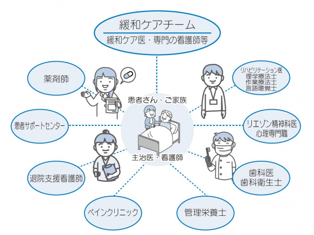 お体や気持ちのつらさに対応する医師をはじめ、看護師・薬剤師・リハビリテーション・心理専門職・管理栄養士・歯科衛生士・医療ソーシャルワーカーなどの多くの専門職でチームを組んでいます。多職種で連携して対応させていただくことで、多岐にわたるつらさが和らぎ、お困りごとが減ることを目指しています。まずは主治医や担当の看護師など、近くの医療者にご相談ください。必要に応じて緩和ケアチーム等多職種のスタッフにご紹介いただけます。