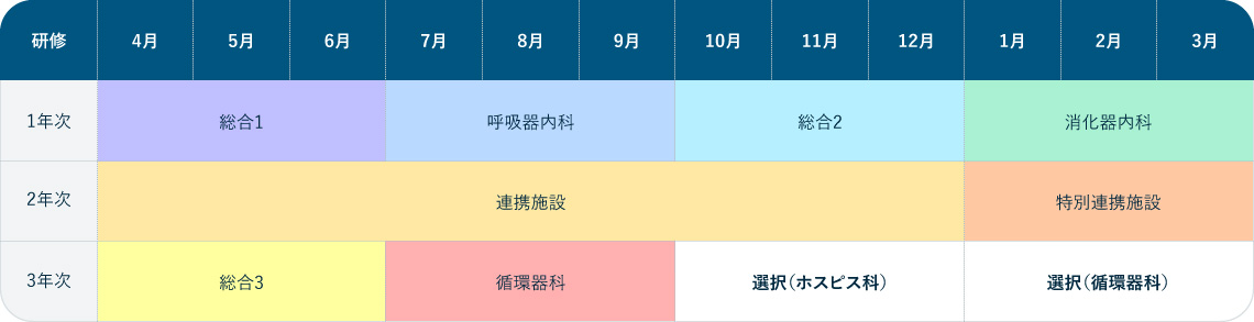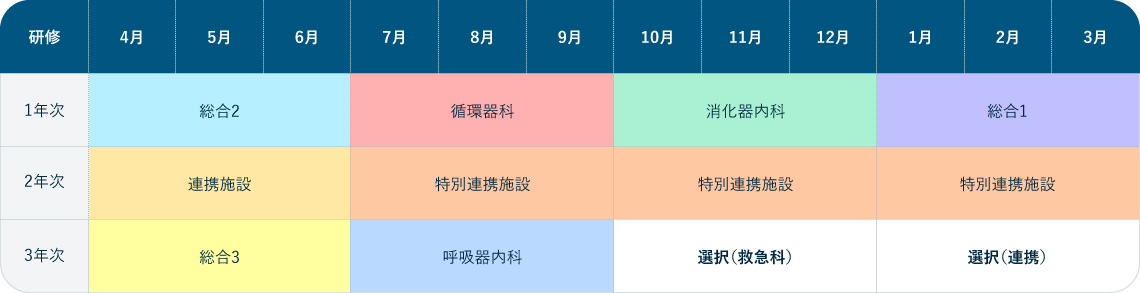 各領域における研修期間も3ヶ月の期間(またはコースにより2ヶ月)をとることで、経時的な診療の経験を得やすいように設計されています。