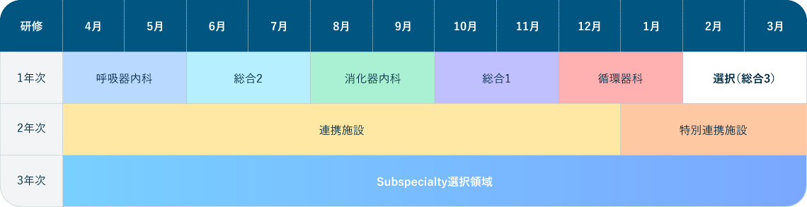 また3年次には基幹施設での各領域3ヶ月ずつの研修ですが、一部に個別選択期間を設け、より深めたい領域の研修が可能です。内科領域における、各領域をじっくりを時間をかけて経験していくことで、総合力の高い内科専門医を目指していける研修となっています。
