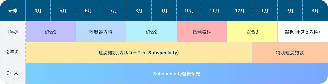 また3年次には基幹施設での各領域3ヶ月ずつの研修ですが、一部に個別選択期間を設け、より深めたい領域の研修が可能です。内科領域における、各領域をじっくりを時間をかけて経験していくことで、総合力の高い内科専門医を目指していける研修となっています。
