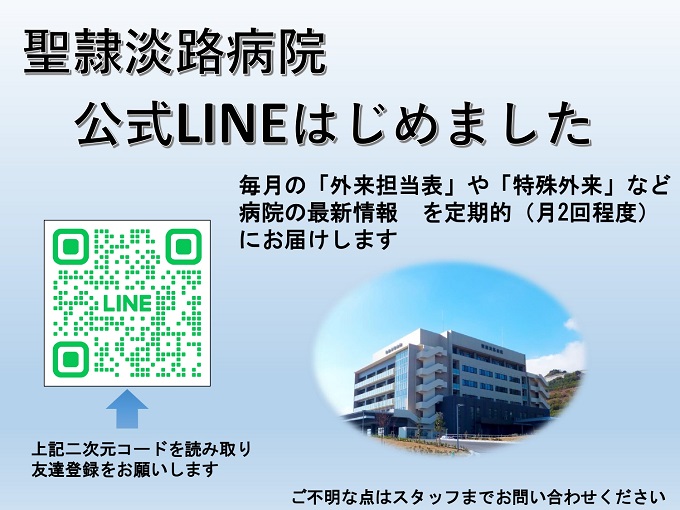 聖隷淡路病院の公式LINEを開設しました二次元コードを読み取りご登録ください今後は、月に2~3回程度、病院からの情報を配信します。外来予定やイベント他、診療案内などを予定しています多くのかたにご利用いただければ幸いですぜひご利用ください