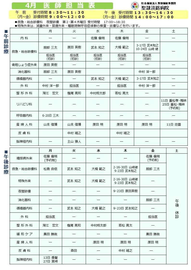 | 診察時間 | 午前 | 9時00分~ *診療科によって異なる場合があります |