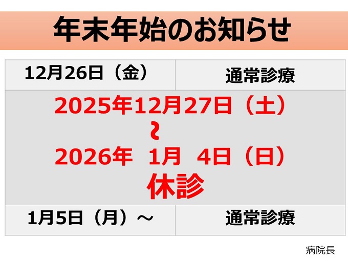 年末年始の診療につきまして、下記の通り休診となりますので、よろしくお願いいたします。