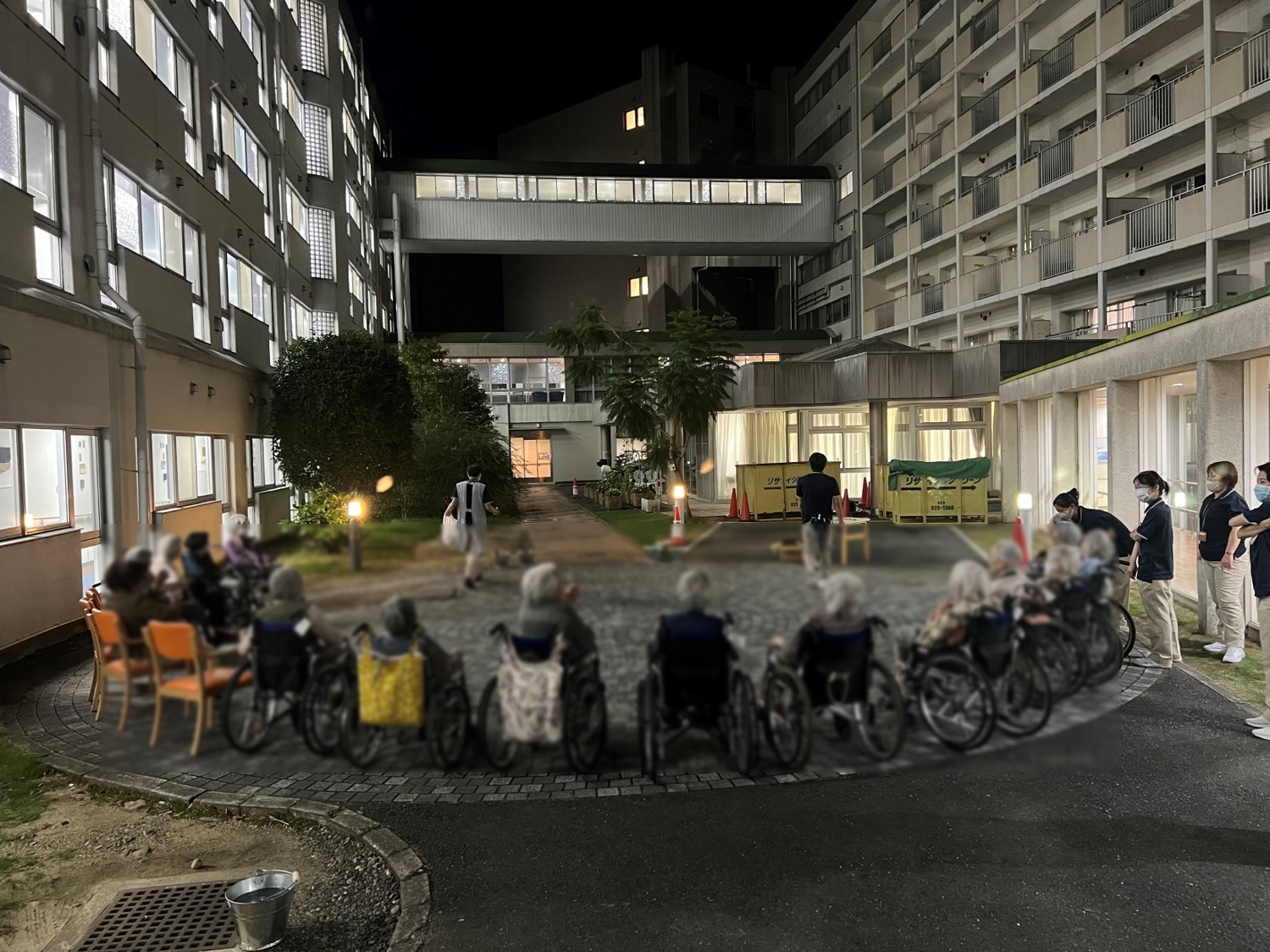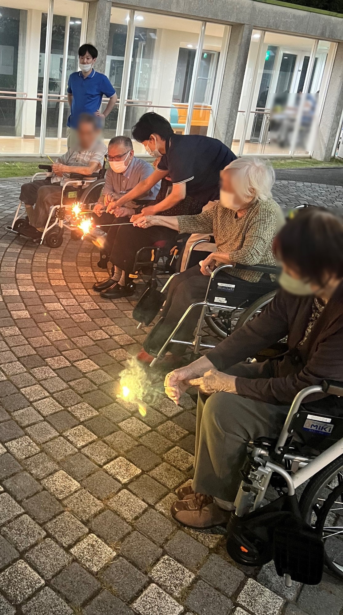 お彼岸を過ぎても残暑が続く夕暮れ時、ケアセンターのご入居者に花火を楽しんでいただこうと花火レクを行いました。