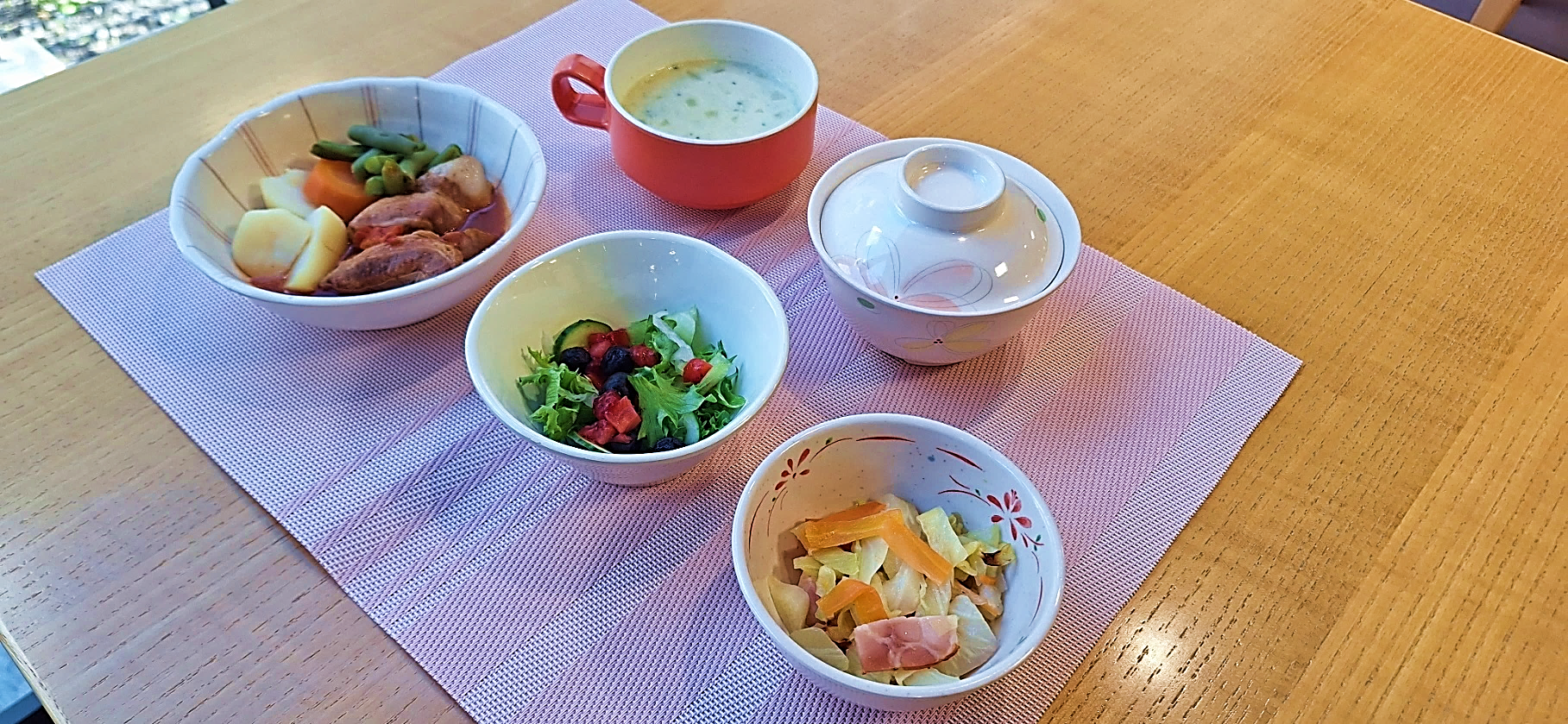 ◆夕食A:三方原ポークの赤ワイン煮込み、野菜とベーコンのソテー、ベリーサラダ、ミルクスープ、米飯