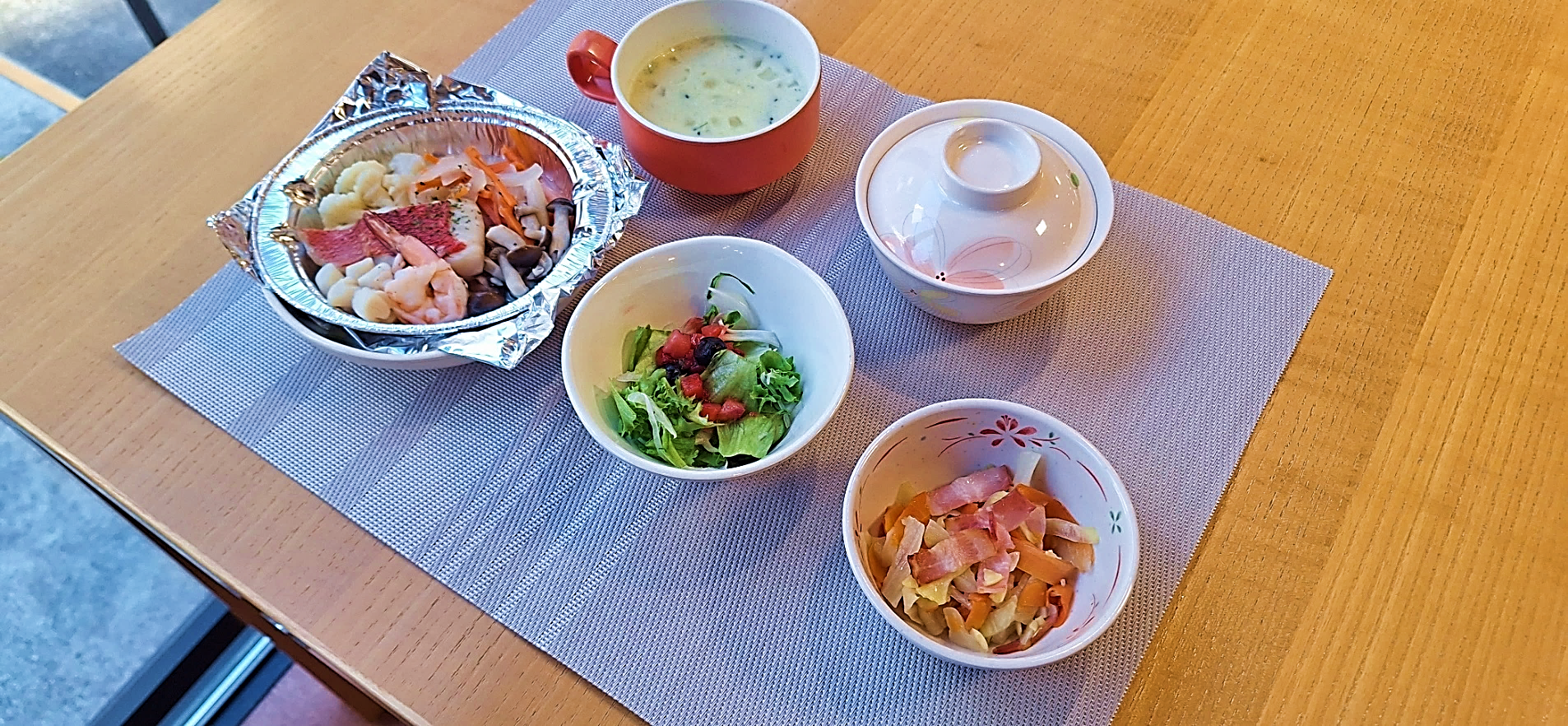 ◆夕食B:魚介のホイル蒸し、野菜とベーコンのソテー、ベリーサラダ、ミルクスープ、米飯