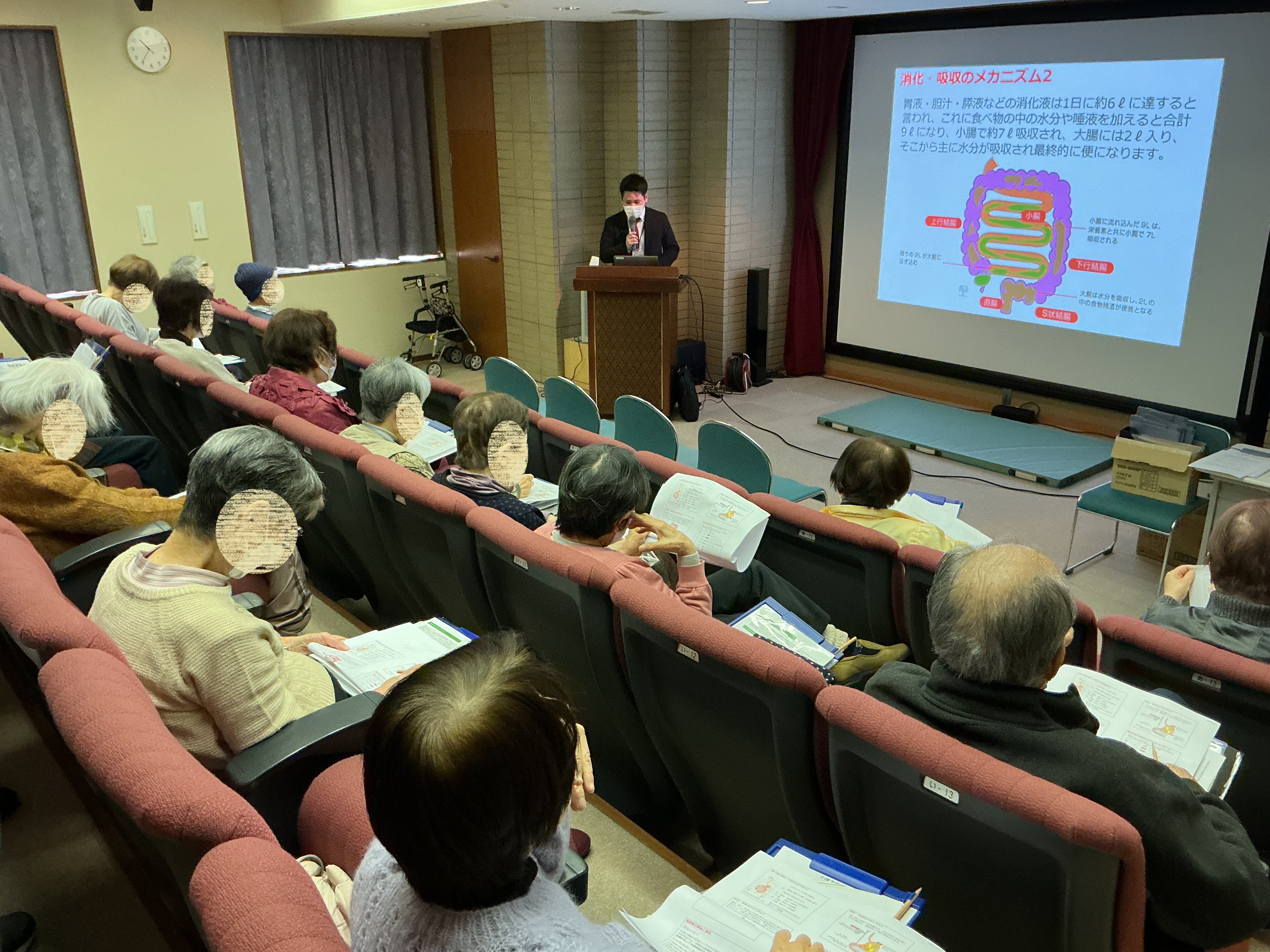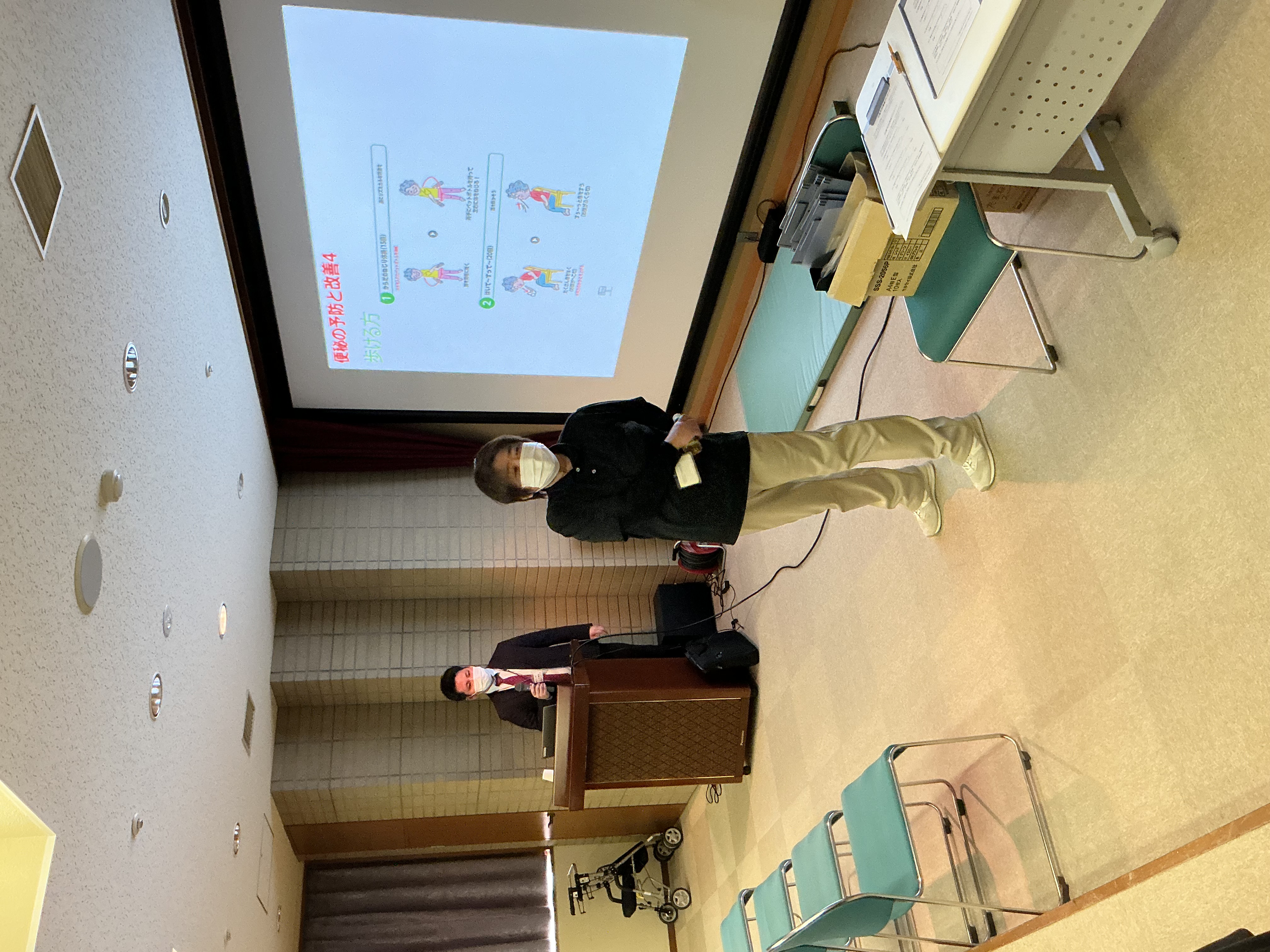食物繊維の食事摂取、こまめな水分補給について、便秘の予防と改善のポイントのお話や、作業療法士直伝、体のねじり体操、座ったままできる呼吸法などの実践タイムもありました。