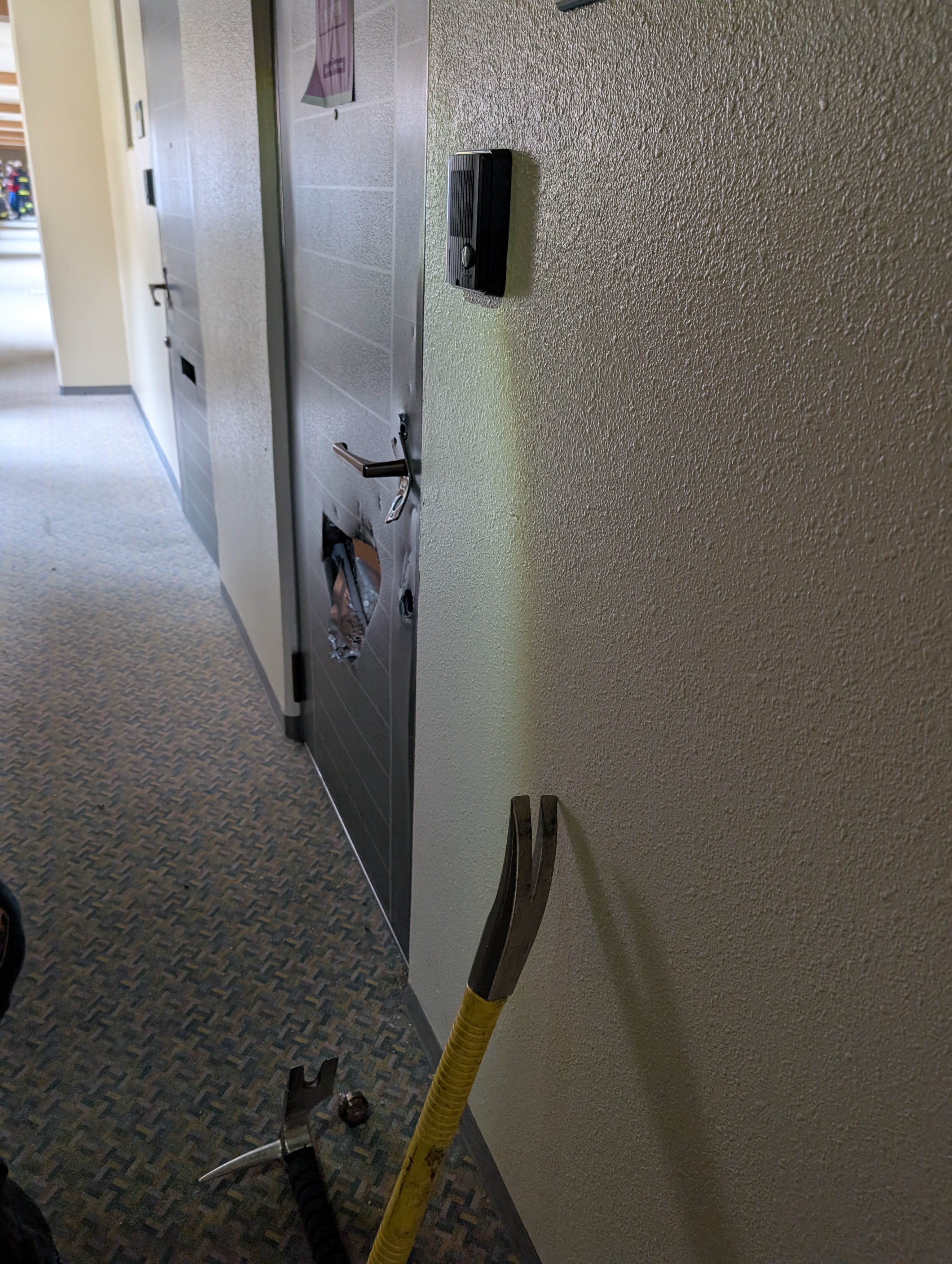 「部屋の中で火事が起こっているが、鍵がないため中に入って消火・救出活動ができない」という際に、部屋の玄関ドアをハリガンツールなどの器具を使用して破壊します。ポストから穴を広げて手を入れ中から鍵を開ける方法や、鍵のシリンダー部分のみの破壊する方法などの訓練をしていました。
