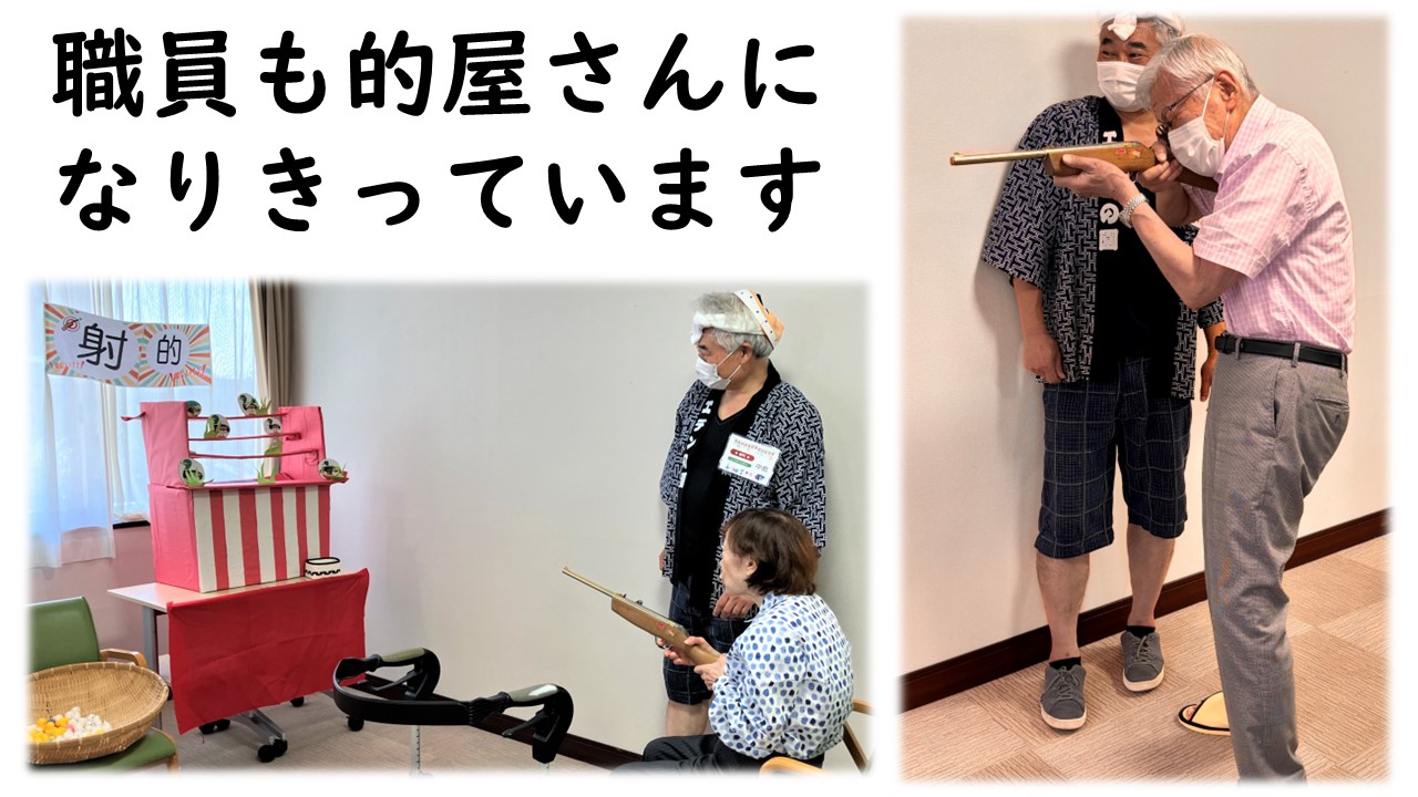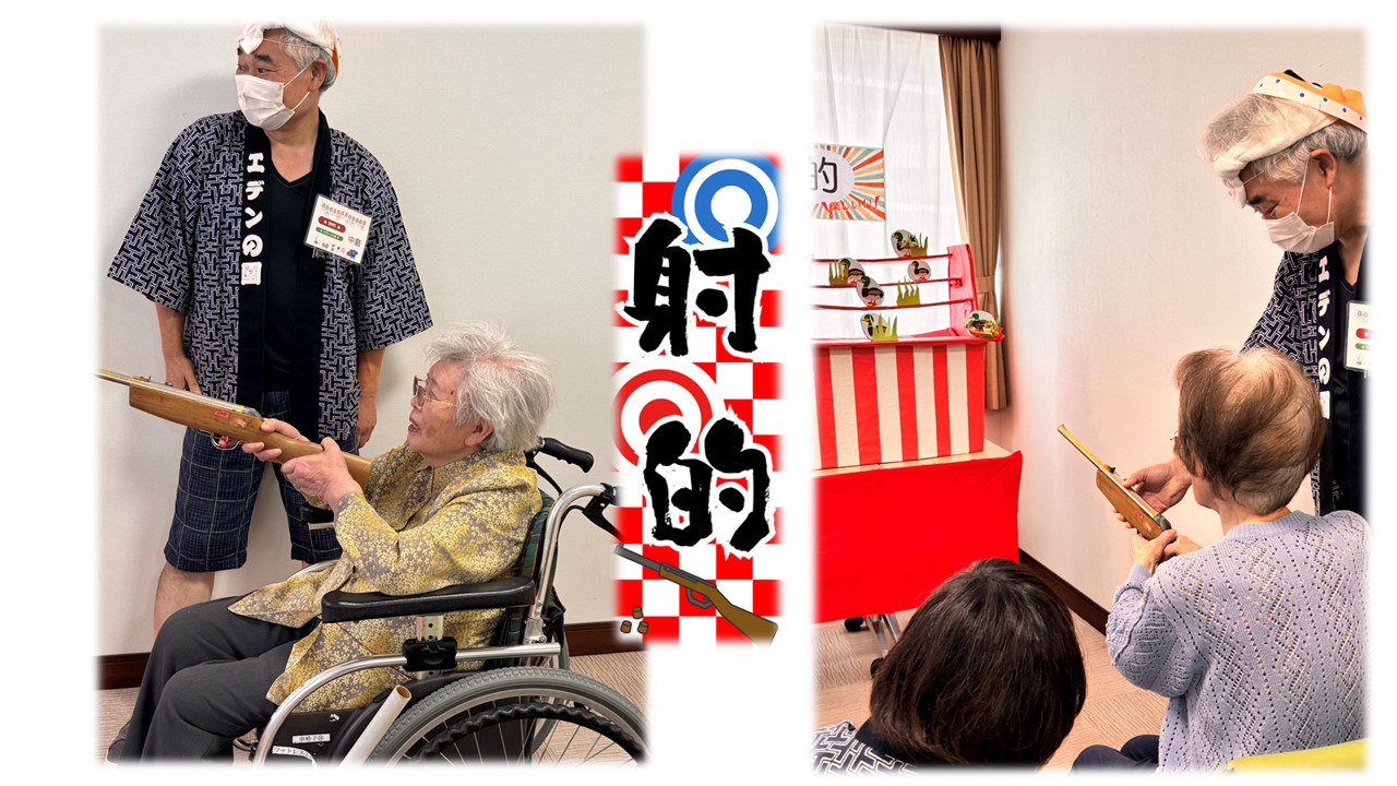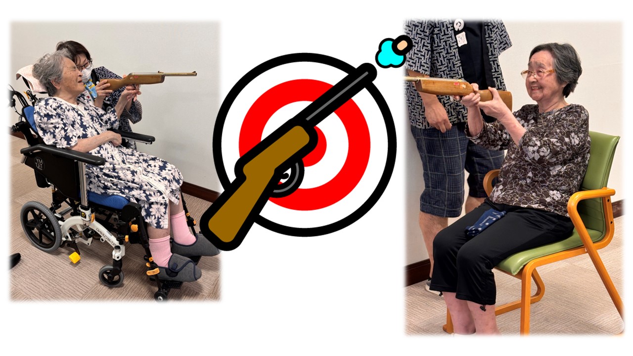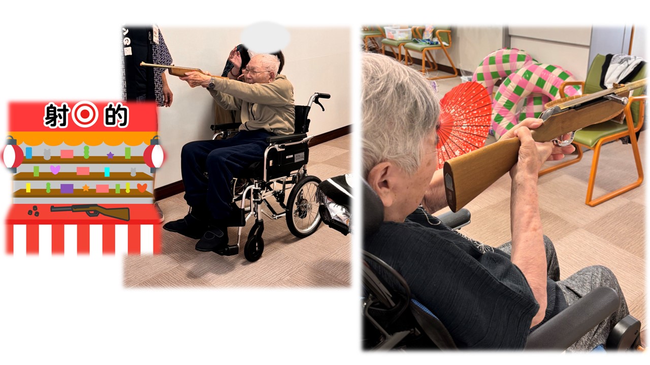2025年度、納涼祭を開催しました。縁日イベントで一番の盛り上がりを見せたのが『射的』です。皆様の構える姿や狙う目線がカッコよくて♪狙った的をしっかりと撃ち抜いていました。(近距離ですが)スナイパーがたくさんでした。※各ご入居者からは許可を得て掲載しています。